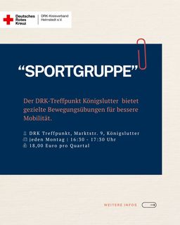 Ziel ist es, durch gezielte Bewegungsübungen die Mobilität und Lebensqualität zu verbessern. Vorkenntnisse sind nicht erforderlich. Es wird gebeten eine Gymnastikmatte mitzubringen.Kosten: 18,00 Euro pro Quartal (eine DRK-Mitgliedschaft ist nicht erforderlich)Anmeldung und weitere Informationen unter DRK KV Helmstedt e.V., Alexandra Grundmann und Elke Menzel-Schäfer Tel. 05351/5858-25 oder per Mail alexandra.grundmann@drk-kv-he.de.