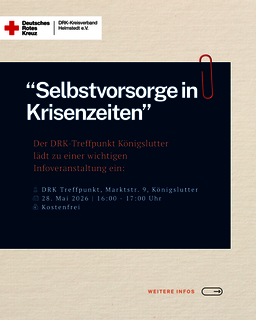 Informationsveranstaltung zum Thema BrandschutzKönigslutter. Der DRK Treffpunkt, Marktstr. 9 in Königslutter lädt am 15. April 2026 von 10.00 – 12.00 Uhr zu einer Informationsveranstaltung zum Thema Brandschutz im Haushalt ein. Ziel dieser Schulung ist es, Ihre Sicherheit im eigenen Zuhause und im täglichen Umfeld zu erhöhen sowie Ihnen mehr Handlungssicherheit im Notfall zu geben.Inhalte der Ausbildung sind Funktion und Bedeutung von Rauchwarnmeldern, Brandgefahren im Haushalt und täglichen...