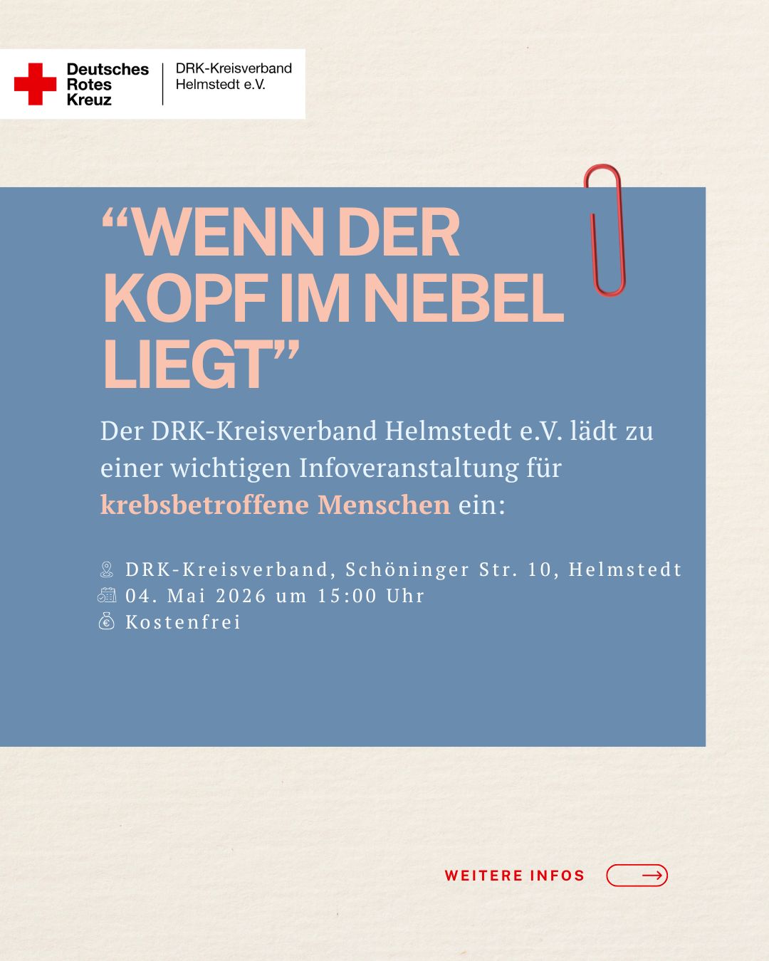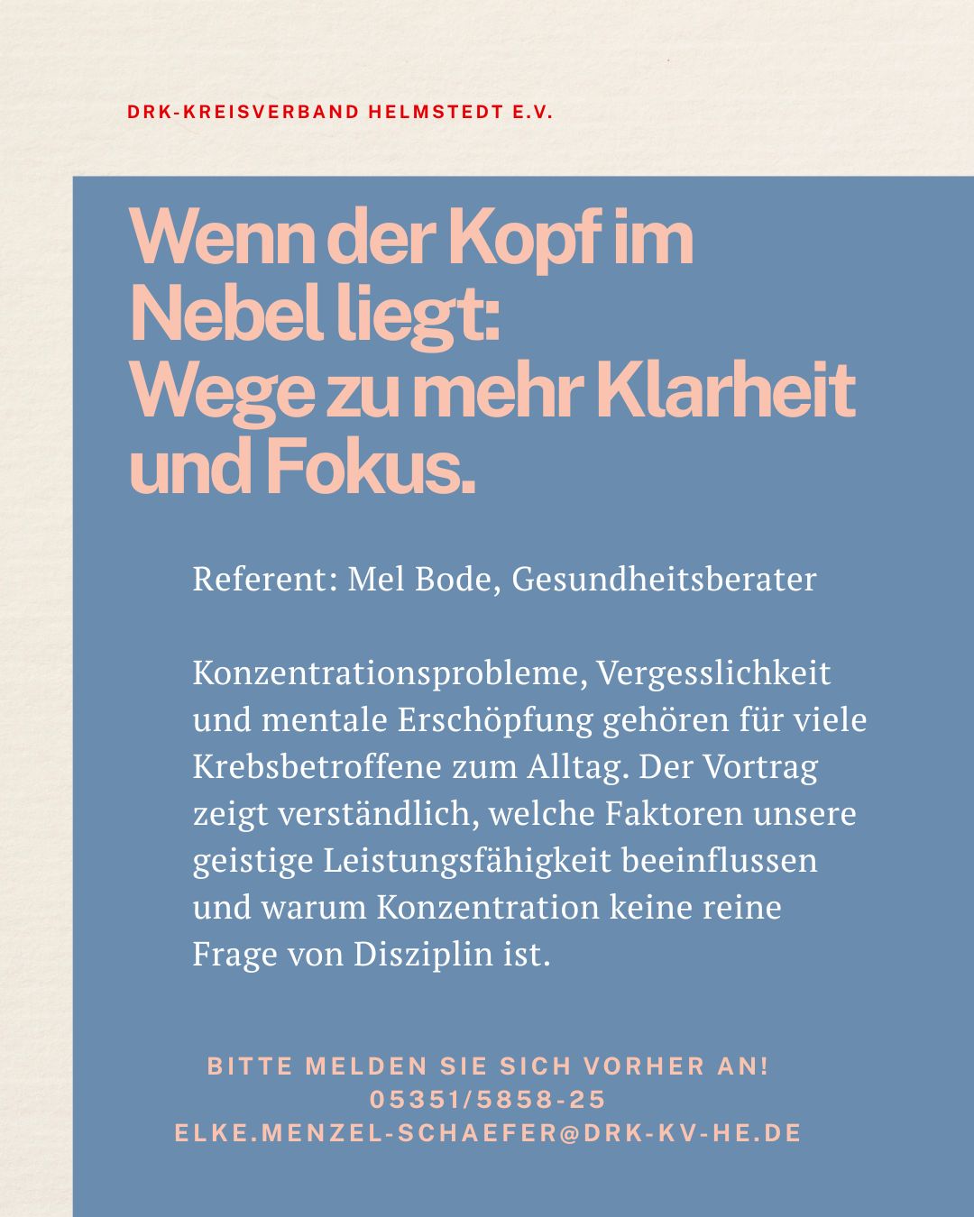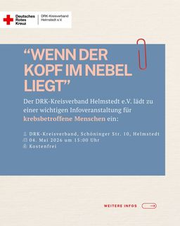 Helmstedt. Der DRK Kreisverband Helmstedt e.V. lädt am 4. Mai 2026 um 15.00 Uhr Krebsbetroffene Menschen zu einem Gesundheitsnachmittag ein. Veranstaltungsort ist das DRK Zentrum Schöninger Str. 10 in Helmstedt. Der Gesundheitsberater Mel Bode aus Braunschweig erklärt: „ Konzentrationsprobleme, Vergesslichkeit und mentale Erschöpfung gehören für viele Krebsbetroffene zum Alltag.“ Der Vortrag soll verständlich zeigen, welche Faktoren unsere geistige Leistungsfähigkeit beeinflussen und warum Konzentration keine reine Frage von Disziplin ist. Praxisnahe Impulse aus den Bereichen Ernährung, Bewegung, Schlaf-und Stressmanagement helfen dabei, Schritt für Schritt mehr Klarheit und Fokus zu gewinnen-ohne Druck, dafür mit mehr Leichtigkeit. Um Anmeldung wird gebeten unter Tel. 05351-585825 oder per Email: elke.menzel-schaefer@drk-kv-he.de. Für Teilnehmende entstehen keine Kosten, der Vortrag wird durch Spendengelder des Benefizlaufes Helmstedt finanziert.